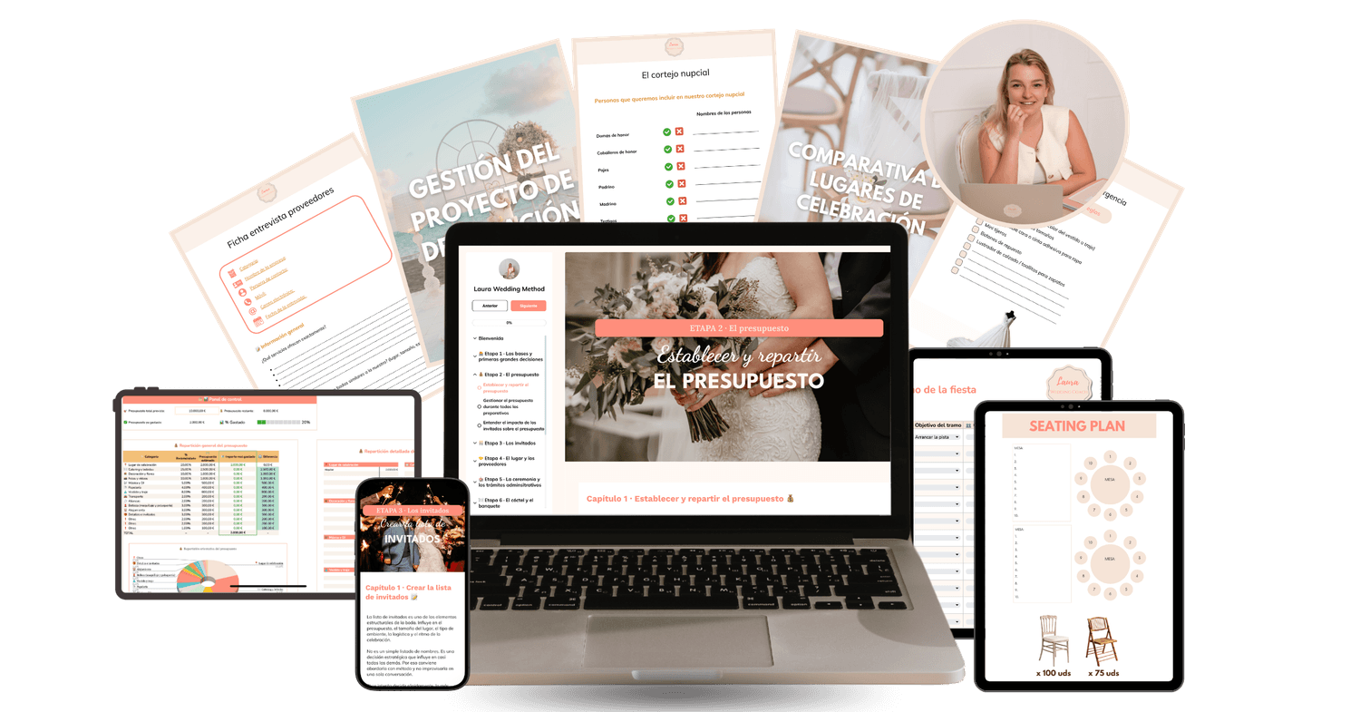✅ Sí. Está diseñado para cubrir toda la organización de principio a fin: presupuesto, invitados, proveedores, decoración, ceremonia, banquete, coordinación... No son consejos sueltos. Es un sistema estructurado que te guía paso a paso y te da las herramientas necesarias para aplicar cada decisión con criterio.