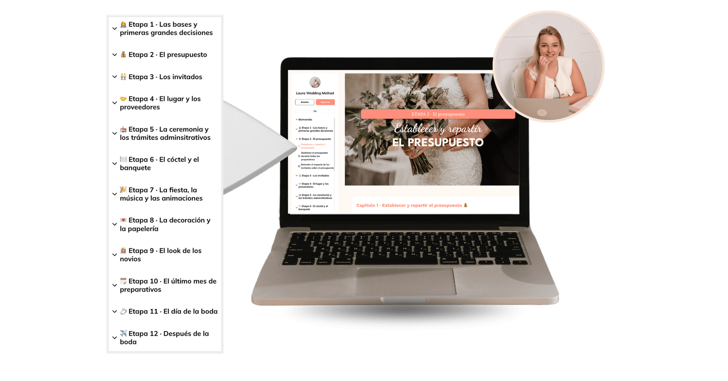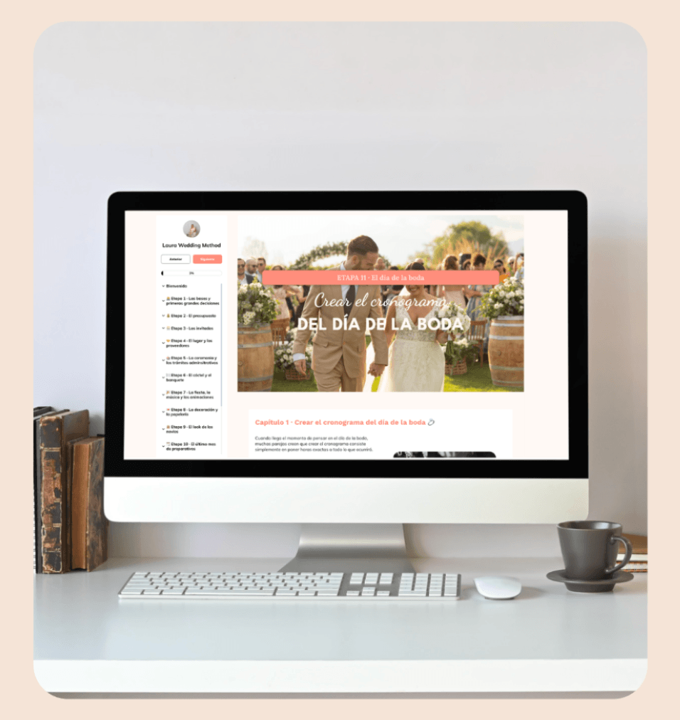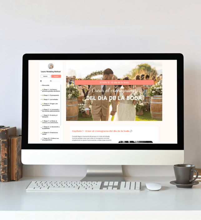 💍 Acceso a la plataforma online con 12 etapas completas que cubren toda la organización de tu boda (presupuesto, invitados, proveedores, decoración, ceremonia, banquete, cronograma...).